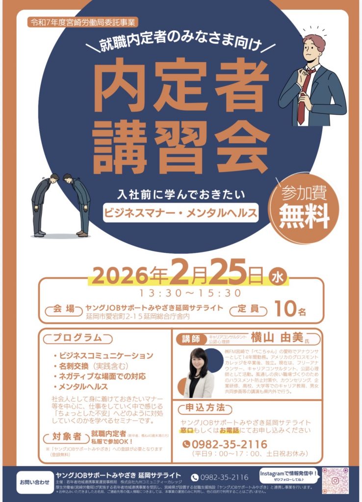 2/25延岡内定者講習会 2026年2月28日 セミナー講演情報 25日は延岡で内定者講習会の講師でした🚗 春から社会人の皆さんなどに社会人としての心構えや ビジネスマナーについて話しました。 同じ目的を持った皆様方、すぐに打ち解けて 笑顔溢れるセミナーになりました。 受講生にも恵まれ、私も良い1日でした。 Screenshot 「3/14 面接対策セミナー」 「2/20 JAみやざき様でハラスメント研修会でした」