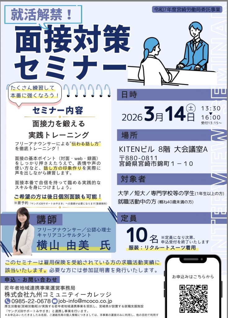 3/14 面接対策セミナー 2026年2月28日 セミナー講演情報 Screenshot 2026年3月14日(土) 13:30~16:00 開催場所 KITENビル 8階 大会議室A 参加も無料です。 是非、お越しください。 「2/25延岡内定者講習会」